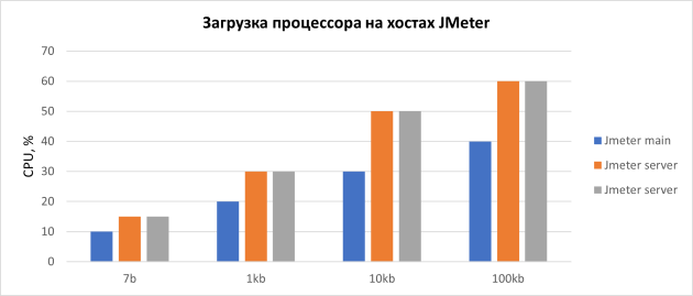 В ходе теста система показала: Загрузка процессора на хостах JMeter - низкая. Наблюдается постепенное увеличение загрузки процессоров хостов JMeter входящих в систему, при увеличении нагрузки.